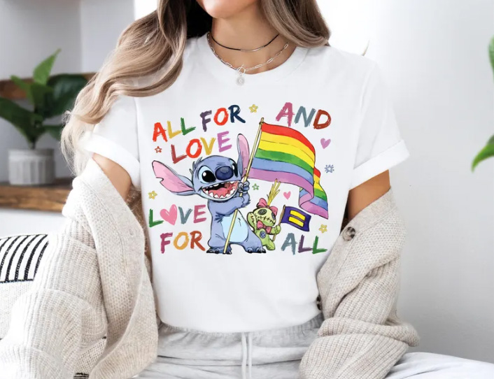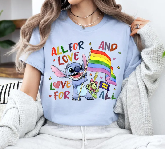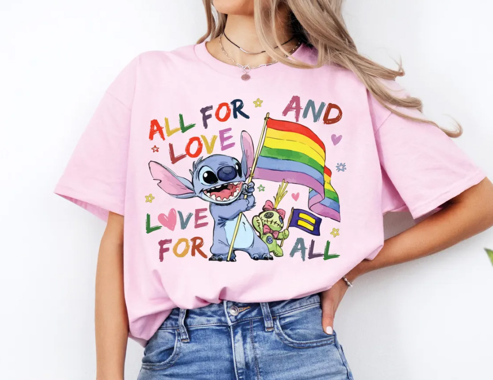 Celebrate positivity with this Disney-inspired tee. All For Love & Love For All – love statement tee- Featuring the lovable Stitch holding a rainbow flag and the inspiring quote “All for love and love for all,” this shirt is more than just fashion — it’s a message of inclusion and unity. Made from soft, breathable fabric, it’s perfect for everyday wear or special occasions like Pride Month. Show your support and let your outfit speak for your values.